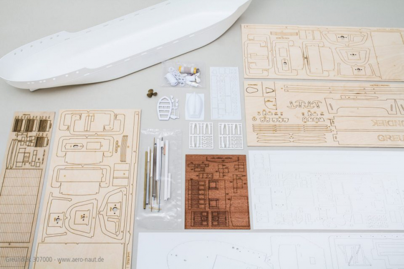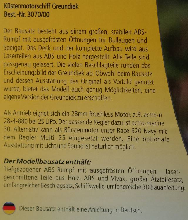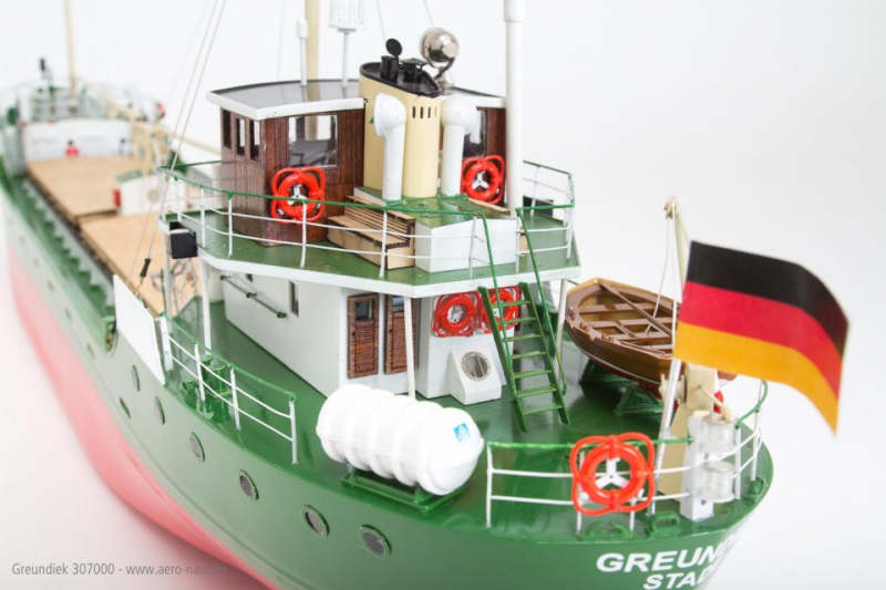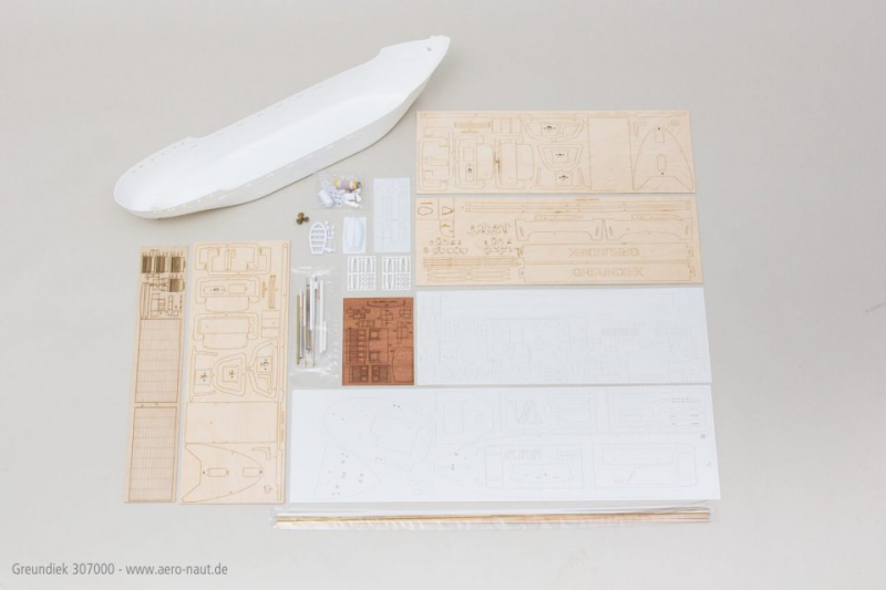 Das Modell wurde unter Zuhilfenahme aller verfügbaren Zeichnungen und vieler Bildern entwickelt. Der Bausatz besteht aus einem großen, stabilen ABS-Rumpf mit ausgefrästen Öffnungen für Bullaugen und Speigat. Das Deck und der komplette Aufbau wird aus Laserteilen aus ABS und Holz hergestellt. Alle Teile sind passgenau gelasert. Die vielen Beschlagteile runden das Erscheinungsbild der Greundiek ab. Obwohl beim Bausatz und dessen Ausstattung das Original als Vorbild genutzt wurde, bietet das Modell auch genug Möglichkeiten, eine eigene Version der Greundiek zu erschaffen.