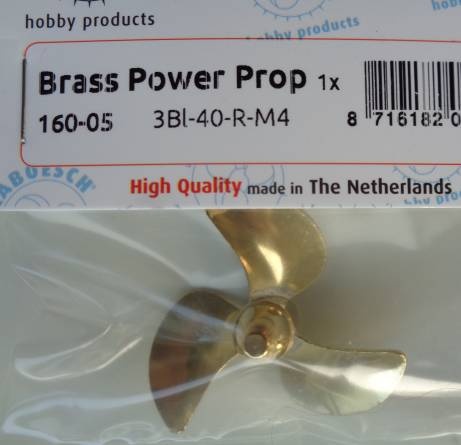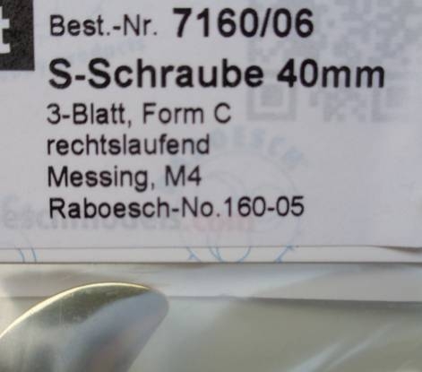 Schiffsschraube, Messing, 3-Blatt,.40 mm, M 4 rechts stumpfe Nabe