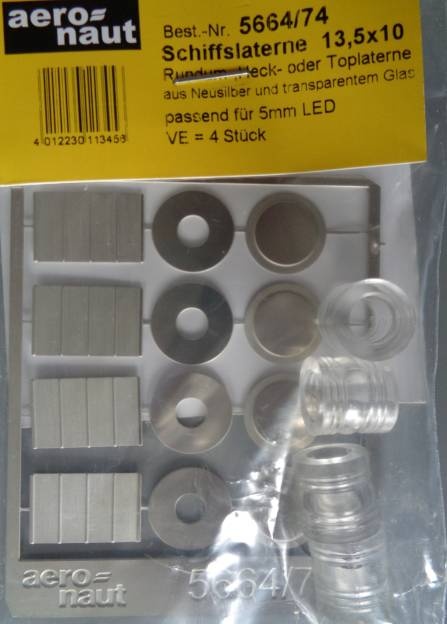 AE 566471 Schiffslaternen, 4 Stück Rundum- Heck- oder Toplaterenen mit Fukß, Deckel und Reflektor aus Neusilber und traspardtenm Lampenglas, passend für 5-mm-LED. Der Refelktor kann wahlweise eingesetzt werden oder entfallen.